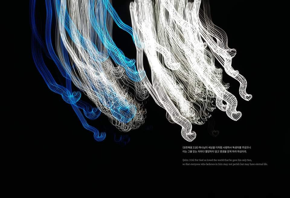 The artist takes pictures of various lights that haven’t been seen before, three-dimensionalizing objects and light. His photographic works have patterns of light, sometimes presenting the various figures. Making patterns in a huge forest or from the buildings, the shining light can also be the work place of the Creator God.
