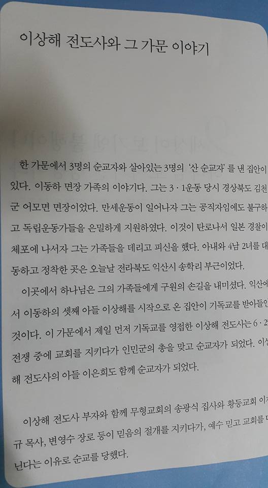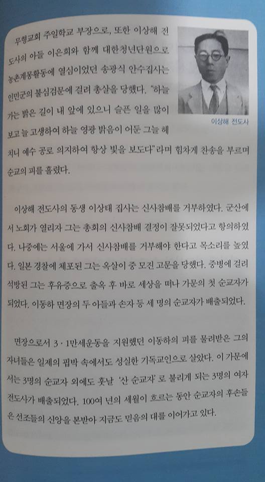 ( 참고. 전영철, "믿음 그 위대한 유산을 찾아서 2", 선교횃불. 2015. pp.291-324 ( 3명의 순교자와 3명의 산 순교자를 낸 이동하 면장. 이상해 전도사 가문).