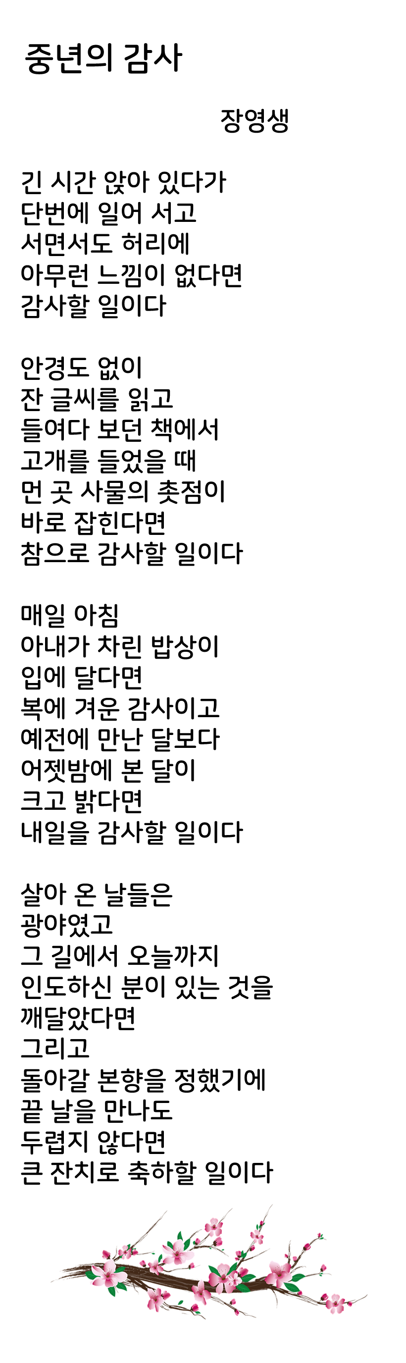 이전 기사보기 다음 기사보기 【신앙시】 중년의 감사 스크롤 이동 상태바 현재위치 문화 【신앙시】 중년의 감사 입력 2021.03.05 08:47 글자 크기 본문 글씨 키우기 본문 글씨 줄이기 프린트 인쇄하기 SNS 기사보내기 기사저장 다른 공유 찾기 이 기사를 공유합니다 닫기 저작권자 © 본헤럴드 무단전재 및 재배포 금지 관련기사 【송광택 목사의 테마독서】 부활 【송광택 목사의 테마독서】 주기도문 【송광택 목사의 테마독서】 노년의 삶 【송광택 목사의 테마독서】 십대 【송광택 목사의 서평】 『풀꽃 향기 하늘에 날리듯』, 최유미 저, 창조문예사, 2005. 송광택 논설위원 songrex@daum.net 다른기사 보기 개의 댓글 회원로그인 작성자 비밀번호 댓글 내용입력 댓글 정렬 최신순 추천순 답글순 BEST댓글 BEST 댓글 답글과 추천수를 합산하여 자동으로 노출됩니다. 닫기 더보기 댓글삭제 삭제한 댓글은 다시 복구할 수 없습니다. 그래도 삭제하시겠습니까? 비밀번호 댓글수정 댓글 수정은 작성 후 1분내에만 가능합니다. 본문 / 400 비밀번호 내 댓글 모음 닫기