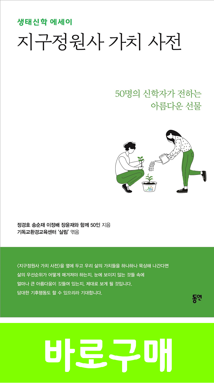 이번에 기독교환경교육센터 살림에서 <지구정원사 가치 사전>이라는 책을 출판함으로 지구 환경에 대해 깊은 관심을 갖게 할 뿐 아니라 지구를 살리는 일에 동참할 수 있는 마음을 갖게 하는 것이 무척 기쁩니다. 성경의 덕목 25가지를 주제로 삼아 신학자들이 진솔하게 들려주는 환경에 관한 이야기를 통해 우리는 우리 자신을 성찰하며 이웃과 자연에 대한 우리의 책임을 통감하게 될 것입니다.