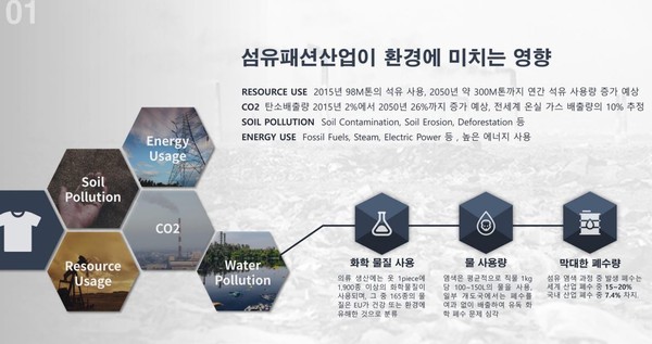 섬유는 석유 자원을 사용한다. 2015년 98M톤의 석유 사용되었고, 2050년에는 약 300M톤까지 연간 석유 사용량이 증가할 것이라 예상하고 있고, 석유 사용은 곧 CO2 즉 탄소배출량 증가로 나타난다. 2015년 2%에서 2050년 26%까지 증가하고, 전세계 온실 가스 배출량의 10%가 될것이라 추정한다.