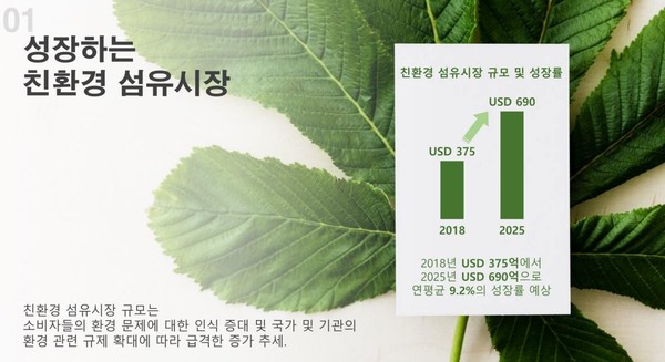 섬유시장에도 새 바람이 불고 있다. 친환경섬유시장 규모는 2018년 375억(USD)에서, 2025년 690억(USD)로 성장할것으로 예측하며, 연 평균 9.2% 성장할것으로 예측하고 있다.