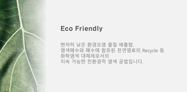 허현범 대표는 친환환경 염료 개발에 많은 시간과 투자를 드렸다고 한다. 천연염색은 신이 주신 자연식물이 원재료이다. 석류껍질(Pomegranate Peel), 꼭두서니 뿌리(Madder Roots), 오배자(Gallnut), 아선약(Catechu, Acacia Catechu), 가자 열매(Ceder, Myrobalan), 히말라야대황, 금잔화, 오디, 뽕잎, 랙(Lac), 쪽(Indigo)-습진 아토피성 피부염등 피부질화에 효과- 등 천연염색 개발에 공을 들인 결과 친환경 원단을 개발하여 수출이 가능해졌고, 친환경천연염색 소재를 바탕으로 수건과 의류 제품을 출시하여 시장에서 좋은 반응을 얻고 있다.