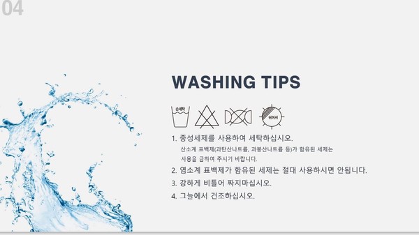 (1)반드시 중성세제를 사용하여 세탁한다(산소계 표백제-과탄산나트륨, 과봉산나트륨 등이 함유된 세제는 사용을 금해야 된다).