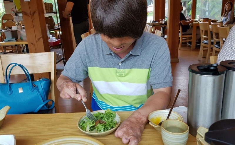 그는 그런 손으로, 그런 몸으로 항상 말없이 봉사를 한다. 최근에도 음성치료원에서 4일정도 혼자 제초작업을 하였다. 그런데 얼마 전에 치료원의 화장실 배수로 공사를 하다가 손을 다치게 되었는데 화상을 입은 손인지라 자유자재로 움직일 수 없어서 무리하게 사용하다 보면 상처가 나게 되고 잘 낫지 않는다. 아직 상처가 아물지 않은 그곳으로 세균이 들어와 손이 붓고 온몸이 열이 나며 아파서 2주 정도 앓고 있다고 한다. 주님께서 귀한 집사님을 빨리 치유해주시기를 기도드린다.