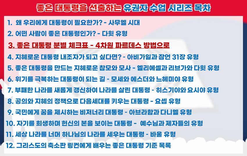 한 나라를 통치하는 지도자인 대통령에게는 보통 사람들이 볼 수 없는 능력이 요구된다. 적어도 대통령은 일반 국민과 다르게 지금의 나라 상황을 바르게 진단하고 앞으로 나아갈 방향을 국민들에게 실제적인 지침을 제시해야 한다. 대선에 즈음하여 여론 조사 기관들이 대통령 적합도에 대한 통계를 계속 발표한다, 하지만 가관마다 조사방법이 다르고 질문 항목에서 보면 한계가 있다. 대부분 국민들이 생각하는 측면에서 여론의 성향에 따라 조사한다. 이것으로는 제대로 자질을 검증하기 어려운 상태다. 각자 자기 기준에 근거하기에 판단 자료로 한계가 있다. 마치 사사 시대에 백성의 마음에 맞는 기준처럼 그것을 기준으로 삼고 있는 경우가 많다,