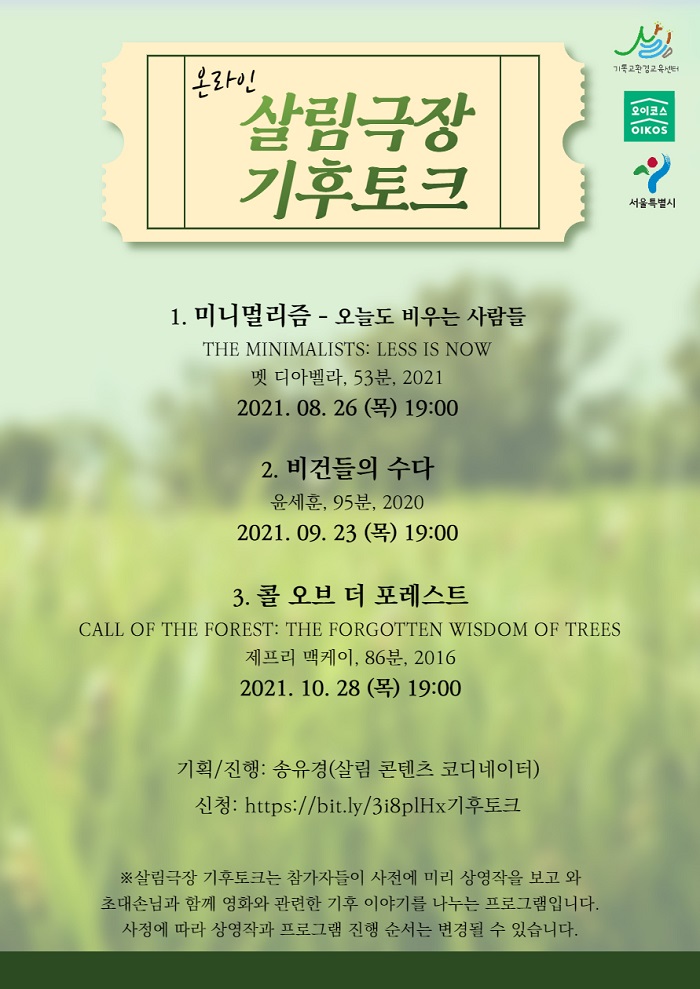 기독교환경교육센터가 주관하고 서울시가 후원하며, 장신대 오이코스와 충신교회 청년부가 함께 하는 '살림극장 기후토크'가 올해도 진행된다. 기후토크는 참가자들이 주제토크에 앞서 기후와 환경과 관련된 영화를 미리 감상하고 줌으로 초대 손님과 함께 토의에 참가하는 방식이다.