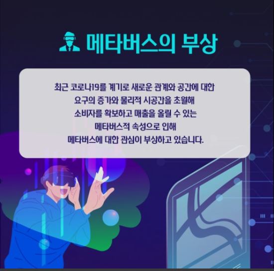 메타버스(metaverse)란 초월이라는 뜻의 '메타(meta)'와 현실세계를 의미하는 '유니버스(universe)'를 합성한 용어로, 스마트폰과 컴퓨터, 인터넷 등 디지털 미디어에 담긴 새로운 세상, 디지털화된 지구를 메타버스라 부른다. 코로나19 이후 비대면이 일상화되면서 가상과 현실을 잇는 새로운 사회의 장으로 떠오르고 있다.