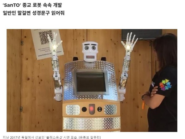 이미 독일의 비텐베르크에 인공지능 로봇목사 ‘블레스유-2’가 있는데, 이 인공지능 로봇목사는 방대한 성경지식을 기반으로 다양한 언어로 사람들에게 짤막한 성경구절을 읊어 주고 축복을 전하며 친절하게 상담까지 하고 있다.