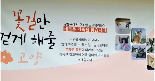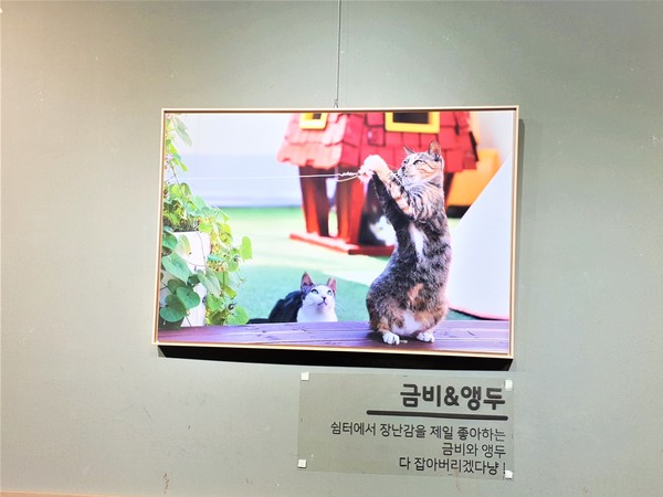 구청 별관 1층에 어울림쉼터에서 제공하는 길고양이 전시관이 있다. 그동안 길고양이를 입양해간 분들의 길고양이 사진이 걸려 있다. 사진에 있는 고양이들은 길거리에 버려진 길고양이들이었다. 그런데 사진으로 보는 길고양이들의 모습이 달랐다. 사진 중에 두 귀가 짤려서 버려진 길냥이의 사진이 있다. 인간의 잔혹함을 보는 것 같았다. 그런데 입양되어 정성스러운 보살핌으로 행복을 찾은 길냥이는 더 이상 길냥이가 아니었다.