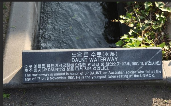 유엔 공원은 우리 나라를 위해 싸우다가 장열히 전사한 분들의 묘지일뿐 아니라 그들 부모님들의 애절한 아픔이 깃들인 장소이다. 그 많은 전사자 중에 도은트라는 호주 병사를 기념하는 수로가 있다. 이 호주 병사는 병사 중에 최연소자로 6.25동란에 참전하여 그 피를 우리 조국에 뿌렸다. 나는 이 도은트라는 어린 소년의 희생을 깊이 생각해 보면 그 부모와 형제 사랑하는 친구의 마음에 얼마나 큰 마음의 고통으로 남았을까를 생각해 본다.