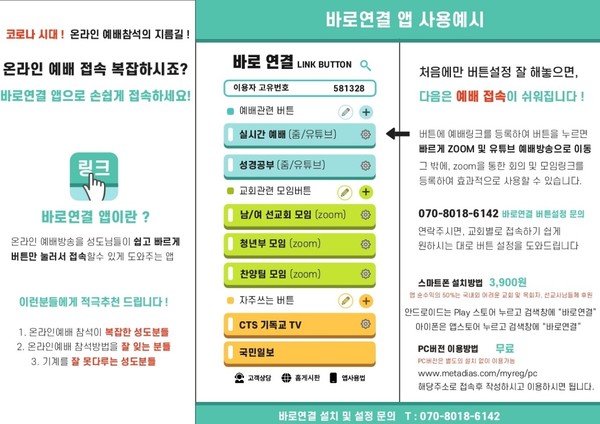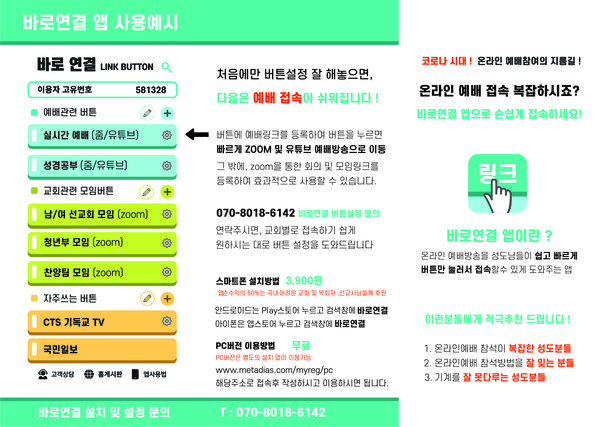 이는 전적으로 한국교회와 선교지의 원활한 온라인 사역을 위해 아주 쉽고 편리하게 연결버튼에 각 교회를 사용하는 줌이나 유튜브의 링크를 저장하여 남녀노소 누구나 연결 버튼만 터치하면 각자 자기가 섬기는 교회의 온라인 예배나 성경공부 또는 기관 모임에 참여할 수 있게 해주는 "바로연결"앱입니다.