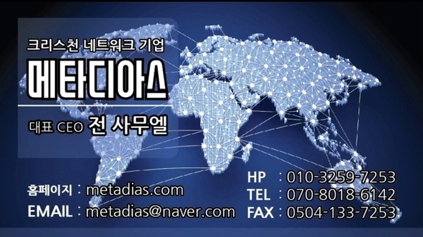 이로 인해 올해 7월 세계 선교와 하나님의 나라 확장에 기여하고자 크리스찬 기업인 메타디아스를 창업하게 되었습니다. 저희 '메타디아스는 다양한 디지털 아이템 및 네트워크 기기와 솔루션으로 인터넷을 통한 각 교회들의 온라인 사역'을 지원하고자 합니다.