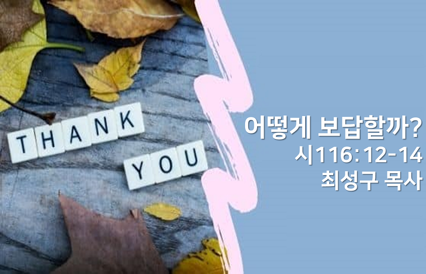 오늘 본문에서는 116:12~14 “12.내게 주신 모든 은혜를 내가 여호와께 무엇으로 보답할까 13.내가 구원의 잔을 들고 여호와의 이름을 부르며 14.여호와의 모든 백성 앞에서 나는 나의 서원을 여호와께 갚으리로다” 시편 116편은 다윗의 시입니다. 다윗은 큰 환난과 슬픔을 당했던 사람입니다. 사울 왕의 핍박으로, 압살롬의 반역으로 고통 중에 빠졌던 사람입니다. 그런 가운데 하나님 앞에 간절히 부르짖어 하나님의 구원을 받았습니다. 다윗은 하나님의 축복에 대한 감격으로 넘쳐 있습니다. 그래서 12절에 “내게 주신 모든 은혜를 무엇으로 보답할까”라고 감탄하고 있습니다. 사망의 골짜기, 음부의 깊은 함정에서 환난과 슬픔을 만날 때마다 하나님께서 다윗의 기도를 들으시고 그 영혼을 사망에서 건져주셨습니다. 정신적인 고통 가운데서 그의 눈물을 닦아주시며 넘어짐에서 일으켜 주셨습니다. 다윗은 이 모든 어려움 속에서 건져주신 은혜를 잊지 않았습니다.