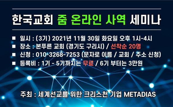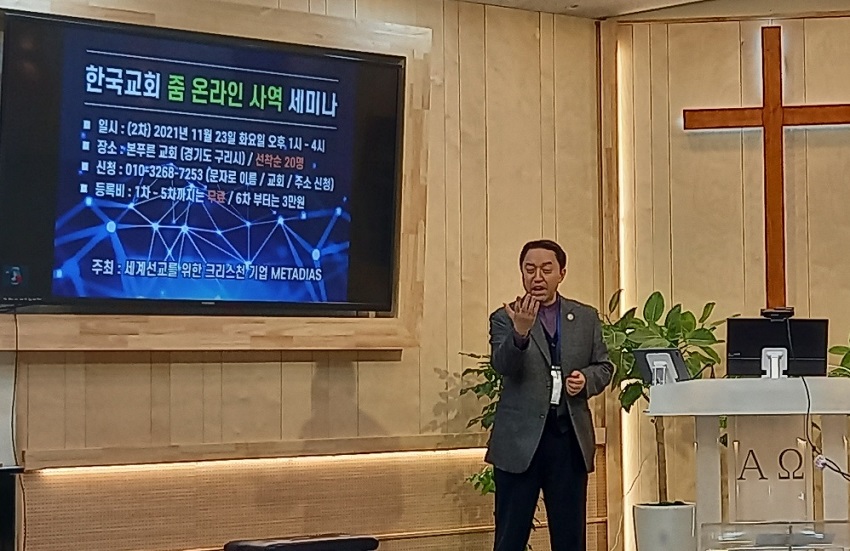 제 2기 한국교회 줌 온라인 사역 세미나가 23일(화) 오후 1시 본푸른교회(구리, 담임 최원영 목사)에서 진행됐다. 세계 선교를 위한 크리스천 기업 METADIAS(대표:전사무엘 목사) 주최로 열린 이번 2기 세미나는 지난 16일 밝은빛전원교회(부천, 담임 이수영 목사)에서 열린 제 1기 세미나에 이어 많은 호응을 받으며 열렸다. 애초 20명의 사전 신청자들로 구성된 특화된 세미나였는데, 26명의 참석자들이 세미나에 등록을 했다. 또 세미나 참석자들은 서울 및 수도권을 비롯해 의정부, 이천, 청주, 세종시, 영월, 속초 등 전국 각지에서 찾아와 줌 온라인 사역에 대한 뜨거운 관심을 보였다. 1부와 2부로 진행된 이번 세미나는 전사무엘 목사의 열정적인 강의에 힘입어 4시간 넘게 진행되는 동안에도 참석자들은 궁금한 점을 바로바로 질문하며 집중했다.