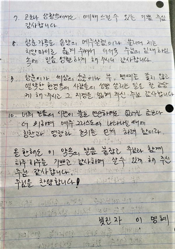 장예지 어린이 "일년동안 저를 잡아주시구, 지켜주시며, 행동 하나 하나를 판단해주시구, 학교생활 즐겁게 할 수 있도록 도우신 주님께 감사, 주의 인자하심을 알게 하심을 감사, 한국을 지켜주셔서 감사, 저를 사랑해주심에 감사, 백신을 맞고 코로나로 지켜주심을 감사, 주를 믿고 따를 수 있게 해주심을 감사"