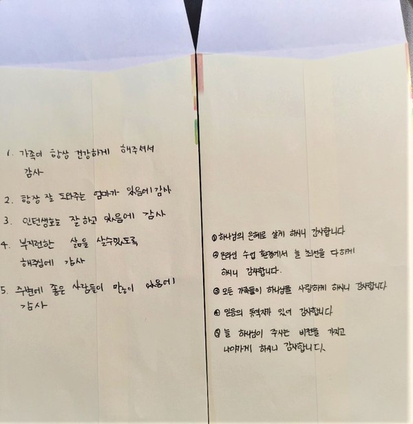 최옥토 학생 "가족평화가 있는 것 , 학교 다니는 것, 좋은 인간관계 유지하는 것, 휴일이 있는 것, 공부하는 것 감사"