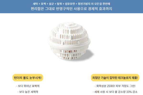 세탁볼은 안전한 활성수가 섬유 속의 때를 분해하여 깨끗하게 헹궈주고, 99.9%의 살균력과 항균력으로 각종 피부염을 일으키는 원인이 되는 세제 잔여물을 제거하여 아기의 순한 피부를 보호하고 현대인들의 건강을 지켜주는 매우 위생적인 제품이다.