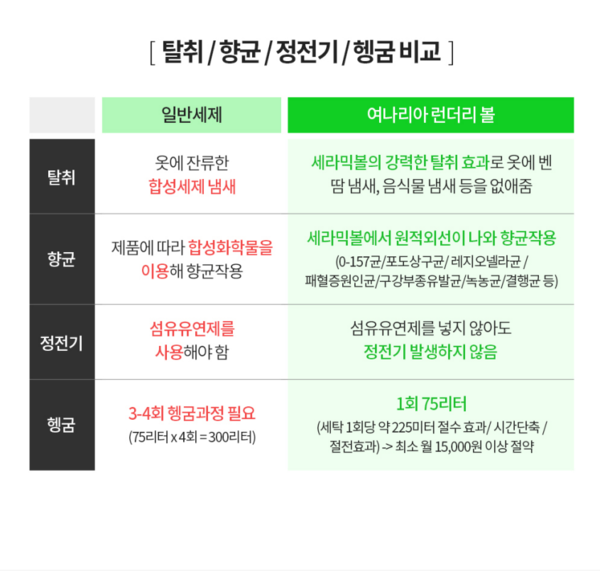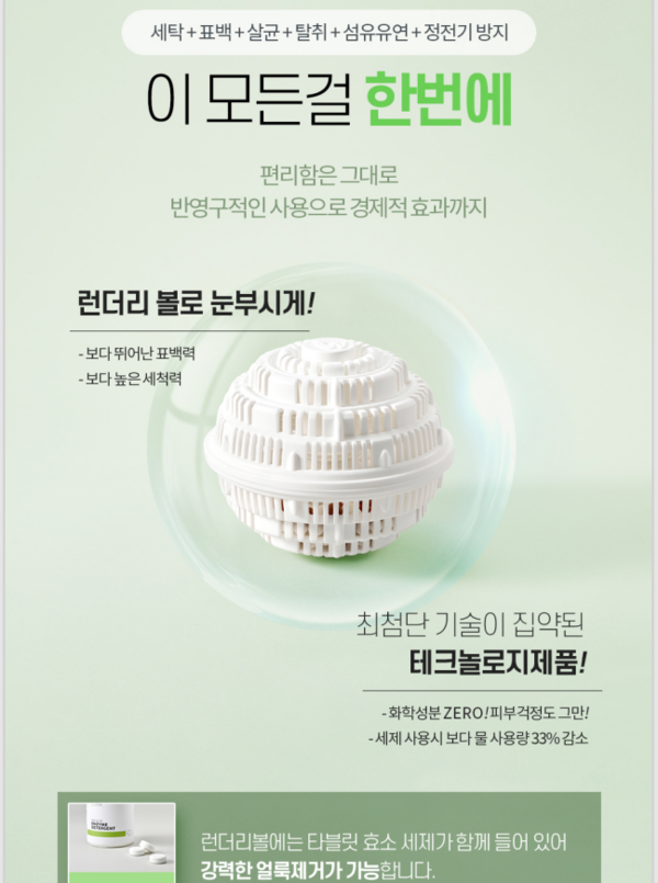 세탁볼은 세제를 사용하지 않고, 세탁하기 때문에 헹굼 횟수가 줄어 에너지와 물이 절약될 뿐만 아니라, 시간을 절약시켜 주기 때문에 쓰면 쓸수록 경제적이다. 또한 한번 구입으로 10년 이상 사용 가능하기 때문에 가정 경제를 위해 꼭 필요한 생활필수품이다.