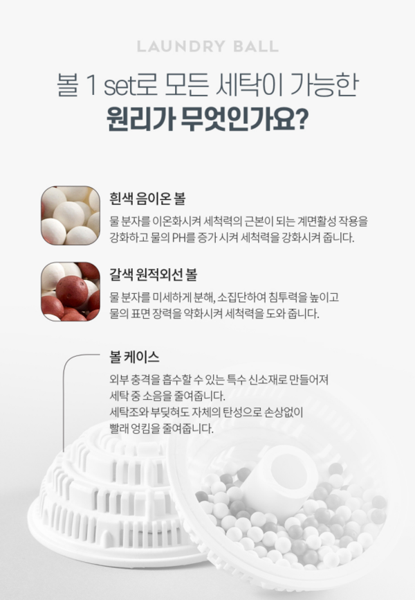 세탁볼에서 발생하는 음이온은 육식위주의 식생활로 산성화 된 몸에 작용하여 각종 성인병과 부인병에 효과가 있다. 세탁볼은 1cc당 892개의 음이온을 방출하여 세탁하는 동안이나 세탁된 옷을 입는 모든 이에게 자연에 가까운 쾌적한 환경을 제공한다.