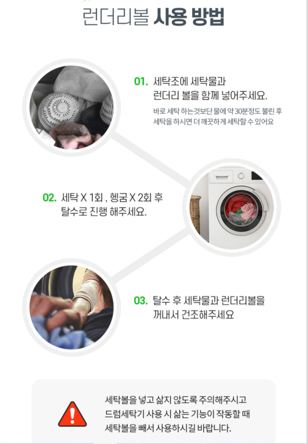 세탁볼을 15일에 한 번 정도 미지근한 물에 여러 번 헹군 후 태양빛에 2시간 이상 건조시키면 좋은 세척력을 갖게 된다.(세라믹의 효과증대)
