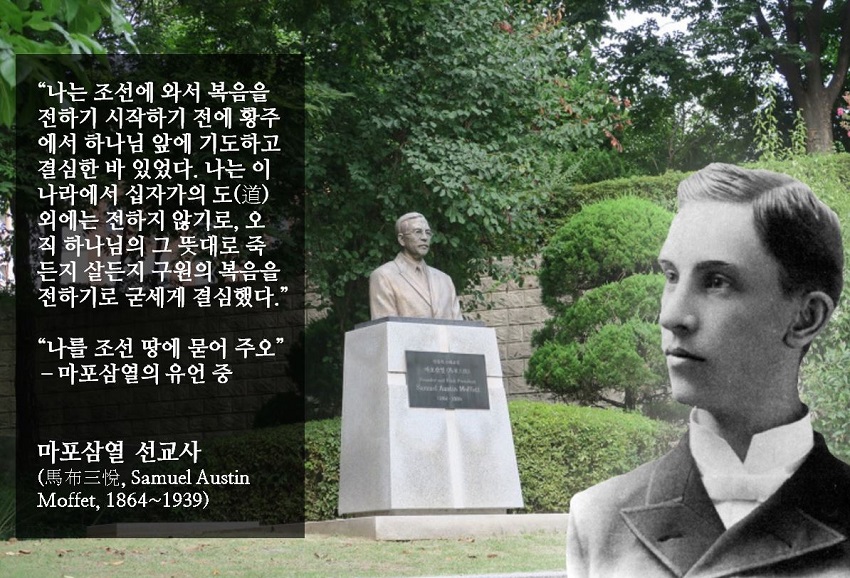 마포삼열(S. A. Moffet, 1864-1939) 선교사는 인니애나주 매디슨에서 출생하여 1890년 한국에 와서 46년간 선교사, 교육자로서 활동을 하였다. 평양에서 22명의 선지생도를 교육한 것이 오늘날의 한국 교회의 지도를 만들었고 장로회신학대학의 전신인 조선예수교장로회신학교를 세운 것이다. 또 숭실전문학교 창설에도 중심적인 인물이 되었고, 1911년 105인 사건 때 미국 장로회 본부 전도국에 보고하였으며 매큔(윤산온)과 에비슨 선교사등과 함께 조선 총독에게 항의하고 또 국제적인 여론을 불러 일으켰다. 그는 1934년 일제 탄압에 활동할 수 없어서 1936년 일단 미국으로 돌아가서 다시 귀국하기로 하고 간다. 하지만 1939년 미국에서 사망하게 된다.
