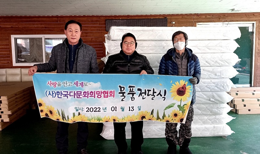 오택관 실장(광무침대)은 13일 오전 회사 직원과 함께 경기도 광주 소재 (사)한국다문화희망협회(경기도 광주시 청림교회 소재) 장윤제 대표를 찾아 직접 기증을 했다. 추운 날씨에도 불구하고 오택관 실장은 직원과 함께 트럭에서 침대를 내리면서 좋은 일에 써달라는 부탁도 남겼다.