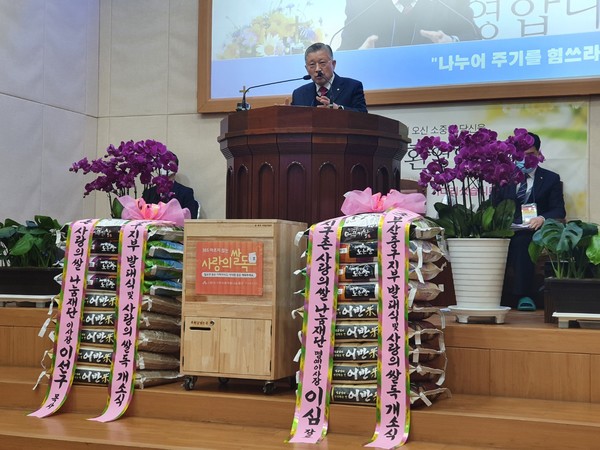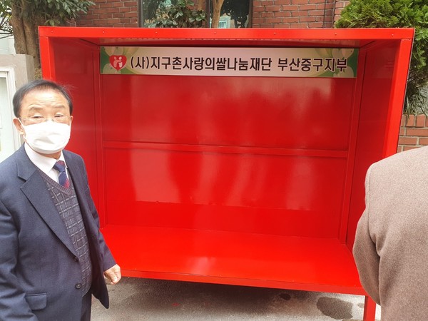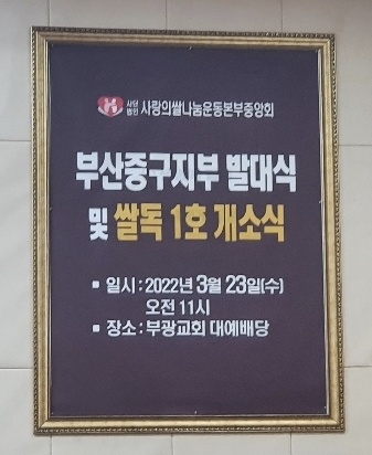 부산의 중구 부광교회(중구 중구로91번길5-1)에서 3월23일(수) 오전 11시에서 부산 중구지부(지부장 이정조목사)의 쌀독 개소식이 (사)지구촌 사랑의 쌀 나눔 재단 주최로 있었다.