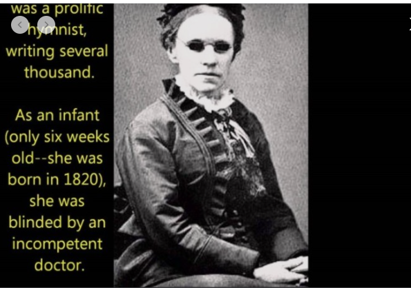 1820년 3월 24일 미국 뉴욕주의 조그마한 마을에서 <패니 크로스비(Fanny Crosby)라는 여자 아이 가 태어났습니다. 그런데 생후 1개월 정도 되었을 때 감기에 걸려 열이 오르면서 눈병이 생기게 되었 는데, 그 집의 가정부가 애기 눈에 엉뚱한 약을 발라준 것이 화근이 되어 그만 장님이 되어버리고 말았습니다.
