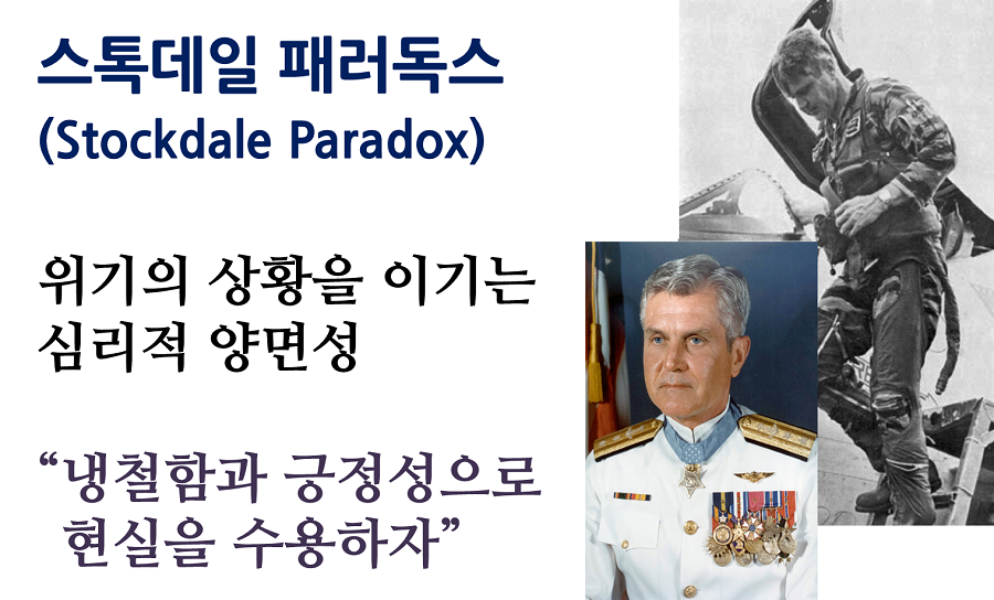 콜린스는 이와 같은 심리적인 양면성을 스톡데일 패러독스라고 이름 붙였다. 이것은 현재 우리가 COVID-19로 인해서 맞닥뜨리고 있는 위기 상황에도 잘 적용된다.