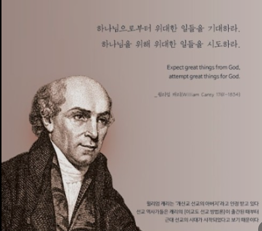 <윌리엄 캐리(William Carrey, 1761.8.17일-1834.6.9)>는 <인도>에서 활동한 <영국 침례교선교사> 로 <개신교 현대선교>의 아버지로 불립니다. <현대 선교>의 문을 연 <윌리엄 캐리>는 이렇다 할 학력이 없는 사람이었습니다.