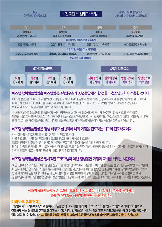 * 이것을 위한 실천으로 거룩한 전쟁의 작은 걸음마를 시작한 “예즈덤행밥”은 예즈덤말씀밥상의 30년 동안 경험되고 준비한 축적된 말씀 컨텐츠와 깊은 말씀노하우를 가진 예즈덤의 젖줄과 연결하여 시작되었습니다. 예즈덤의 실천의 현장으로 56년의 역사를 지닌 과천소망교회와 만나 동역하면서 하나님 나라를 세워 가는 10개월의 가족밥상에서 일어난 복음 사건에 함께 참여하는 시간을 마련했습니다. 이일은 혼자 가는 길이 아닌 예즈덤과 과천소망교회와 한국교회가 함께 가야하는 길이기에 출발부터 같이 시작해보면 어떨지요. 하나님의 거룩한 언약을 이루는 일에 마중물이 되고 쉽습니다. 소중한 여러분을 정중하게 초대 합니다.