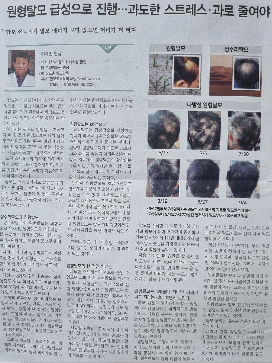 일전에 공진성 조선대 정치외교학과 교수가 신문에 올린 칼럼 ‘대머리가 불편한 이유는 대머리여서가 아니다’라는 글에서, 머리카락이 없어 불편한 것은 신체적인 이유가 아니라 ‘사회의 차별적 시선’이라고 말했다. 그런 의미에서 탈모에서 벗어나게 하는 이해민 원장(모생한의원)은 ‘탈모치료 전도사’라고 말하고 싶다. 이해민 원장은 “탈모, 이제는 교회가 나서야 할 때”라고 말하는데 그 이야기를 들어보자.