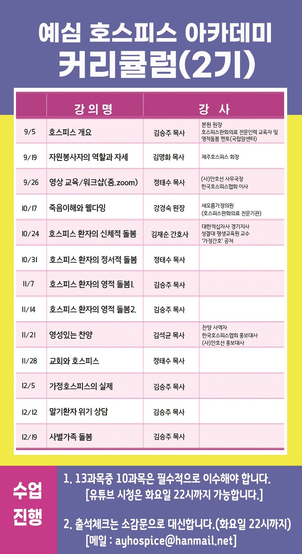 (사)안양호스피스선교회가 주관하는 <예심(예수님 마음) 호스피스 아카데미>가 9월 5일(월)~12월 19일(월)까지 매주 월요일 오후 2시~3시20분까지 온라인 유튜브로 진행될 예정이다.