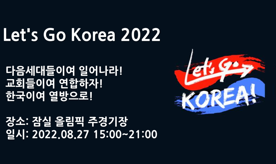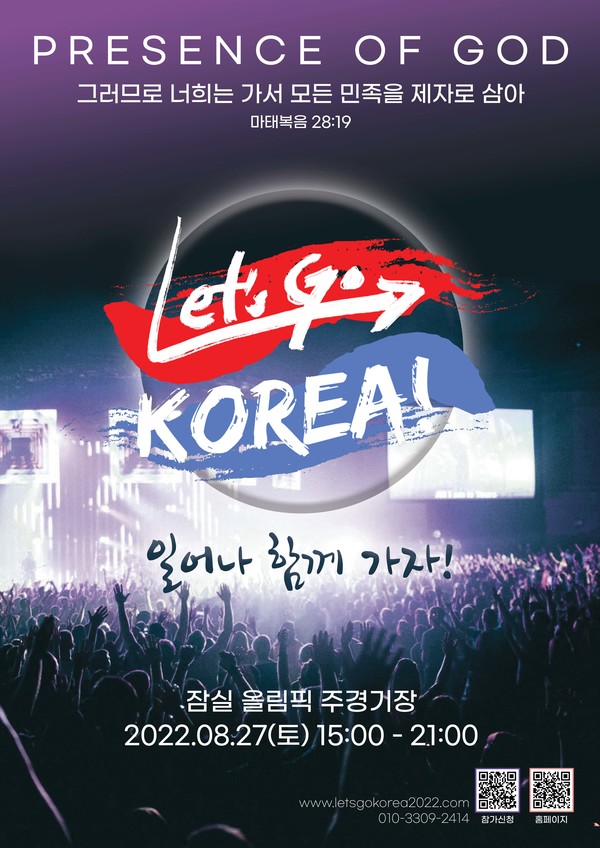 2022년의 여름을 복음의 불타는 사명으로 뜨겁게 달굴 『Let’s Go Korea』성회가 오는 8월27일(토) 15:00~21:00까지 잠실주경기장에서 열릴 예정이다. ‘다음세대의 부흥과 한국교회의 하나 됨 그리고 복음통일과 세계선교로의 헌신’이라는 주제로 열리는 이번 성회는 다음 세대들이 일어서는 강력한 계기가 될 것으로 보인다.
