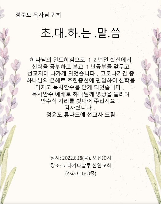 특히, 인생 중반을 넘은 나이에 중국 오지ㆍ말레이시아밀림 지역의 선교사로 헌신하는 중, 22.8.18. 말레지아 현지에서 목사안수를 받는 동생 정윤모 선교사에 기도와 마음을 담아 이 설교문을 나누고 싶어 원고를 다시 소개합니다.