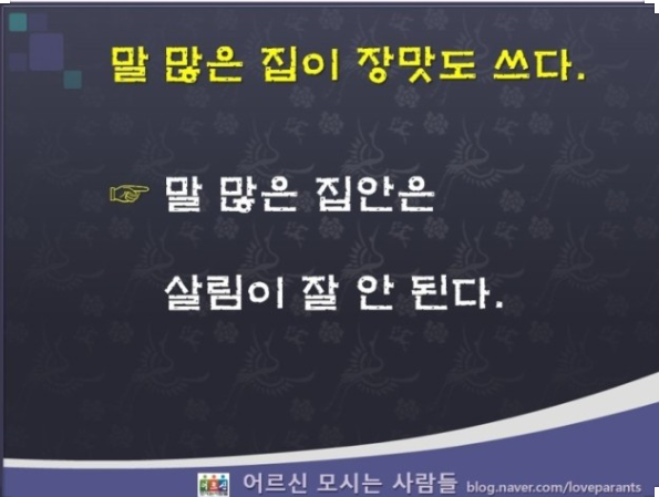 예를 들어, "말 많은 집은 장맛도 쓰다." "말한디로 천량 빚을 갚는다", "오는말이 고와야 가는 말이 곱다", "말 많은 것은 과붓집 종년과 같다", "말은 보태고 떡은 뗀다", "말로는 천당도 짓는다", "말로는 사촌 기와집도 지어 준다", "말 속에 뜻이 있고 뼈가 있다" 등 등이 있습니다. J.레이_말은 마음의 초상이다. 공자_군자는 말이 행함보다 앞서는 것을 부끄러워한다. 노자: 믿음이 있는 말은 아름답지 않고 아름다운 말은 믿음이 없다. 등에서 큰 교훈을 얻을 수 있습니다.