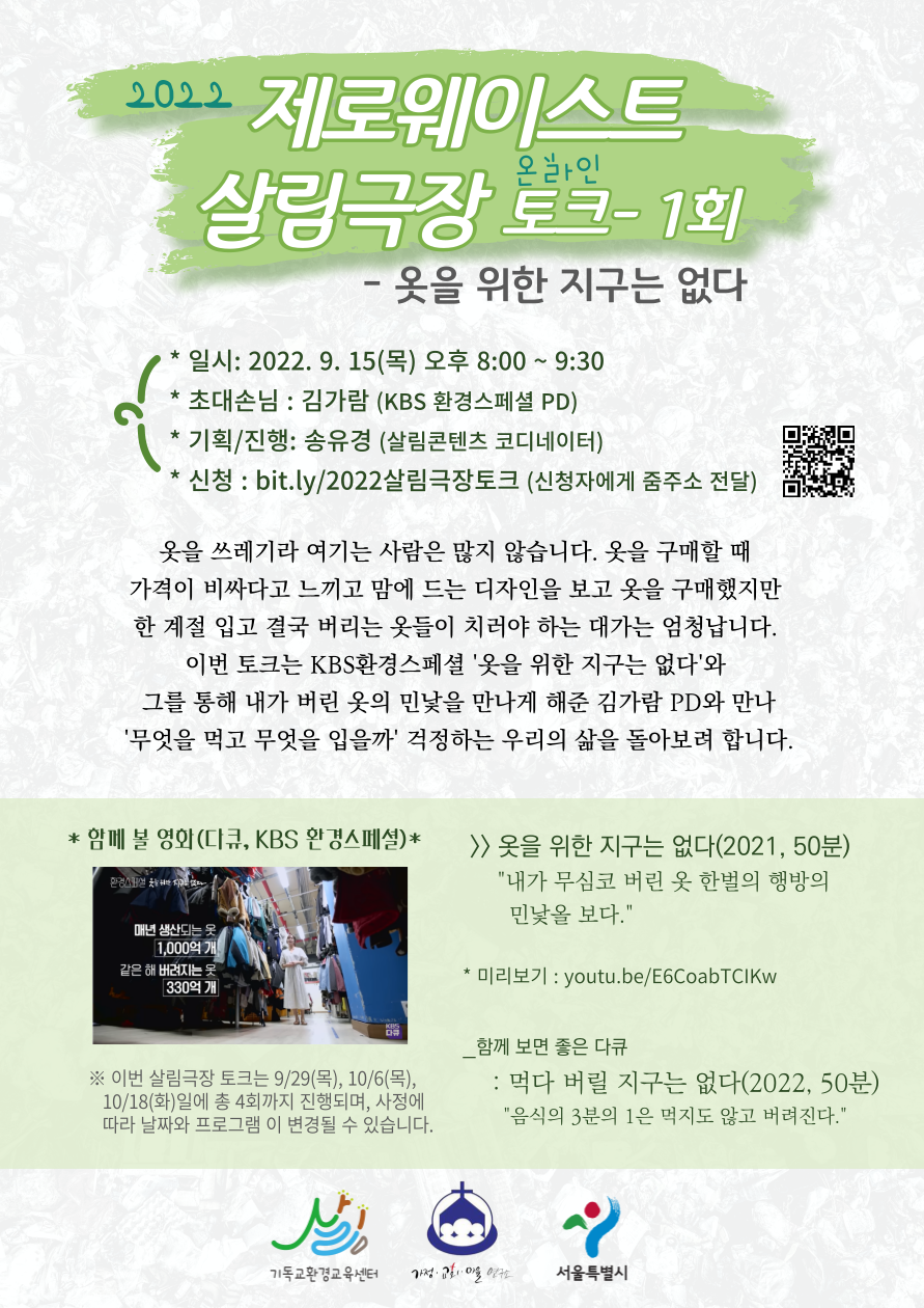 기독교환경교육센터_살림에서 서울시와 함께 '제로웨이스트 생명살림 캠페인'을 진행하고 있습니다. <제로웨이스트 행사시리즈>에 참여하여 나와 내 자손, 모두가 다 잘 살 수 있게 되기를 기도하는 마음으로, '제로웨이스트 살림극장 & 토크'를 진행합니다. 제로웨이스트에 관련된 다양한 영화를 감상하고, 주제와 관련된 활동을 하시는 분들을 초대손님으로 초대하여 함께 이야기 나누는, '제로웨이스트 살림극장 토크'에 여러분을 초대합니다.
