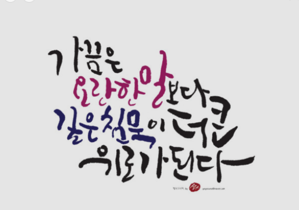 근자, 말을 잘해 나를 돋보이게 하고 경쟁력을 갖게 해 준다는 전문 강사나 아카데미들이 성행하는 중이다. 그러나 말하기를 절제하므로 얻게 되는 소양의 함양이나 품격의 차별화를 가르치는 책이나 강연은 그다지 많지 않다. 정말 말을 잘하고 폼 나게 나를 대변하는 말솜씨가 관계나 비즈니스에서 절대적으로 중요한 것일까? 말은 그 사람의 인품과 가치를 가늠케 하는 행위는 맞다. 그러함에도 말을 많이 함으로 얻는 것 보다 잃는 점이 훨씬 많다는 점을 간과해서는 안 된다. 넘치는 것은 부족함 보다 못하다는 경구가 있듯 우리는 너무 많은 말을 하며 살고 있다. 그 말로 인해 오랜 관계에 금이 가고 부부의 연을 끊게 하는 원인도 따져보면 지나친 말로인해 상처가 되고 앙금이 쌓여 파국을 맞는다. 손바닥은 마주쳐야 소리가 난다. 다른 의견이 충돌할 때 어느 한쪽이 침묵하고 그 순간의 여백을 가진다면 서로를 생각해 볼 수 있는 여유가 생긴다. 짧은 시간일지라도 말의 단절을 통해 감정을 추스를 수 있고 그 공백은 상대의 진정성을 느끼고 오해를 풀 수 있는 시간이 된다. 말을 많이 하게 된다는 것은 자기 방어이며 합리화를 주장하는 수단이 되기도 하지만 침묵은 자신에게 솔직해지는 최선의 방법이다.
