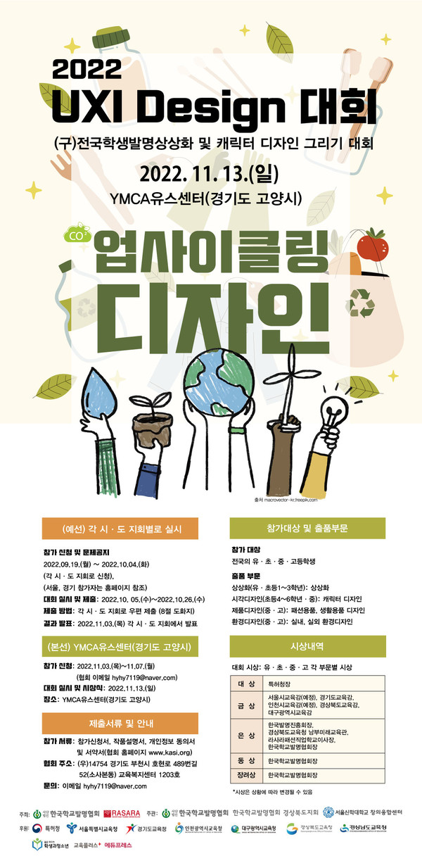 한국학교발명협회는 UXI Design 디자인 대회(구: 전국학생발명상상화 및 캐릭터 디자인·그리기 대회)를 YMCA유스센터(경기도 고양시)에서 실시한다.