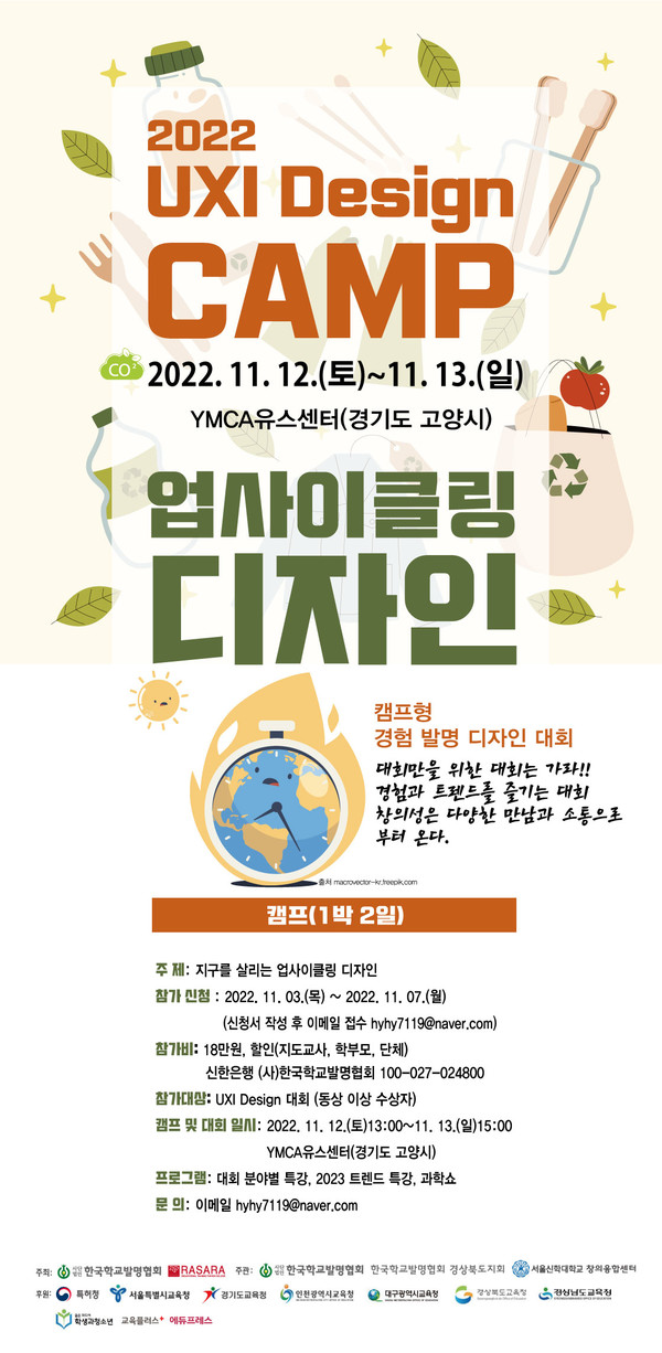 ●사전 설명회(한국학교발명협회 홈페이지)를 시작으로 10.05.(수) 지역별 예선을 거쳐 2022.11.12.(토)~11.13.(일) 본선대회로 캠프형 UXI Design 대회가 열린다.
