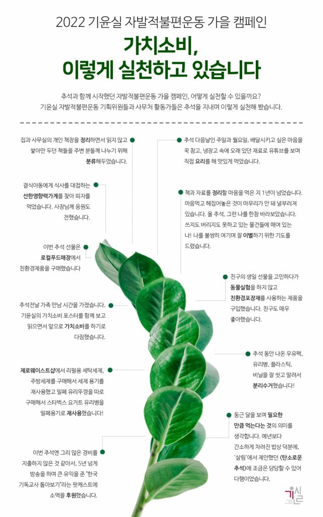 기윤실 자발적불편운동 기획위원들과 사무처 활동가들이 2022년 가을 캠페인 중 하나로 ‘더불어 누리는 가치소비’ 실천 결과물들을 소개했다. 추석 뿐만 아니라 생활 속에서 함께 누리는 삶의 좋은 모델이 될 것으로 보인다.