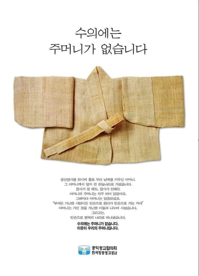 "수의에는 주머니가 없습니다." 헤드라인과 '이웃이 우리의 주머니입니다' 라는 서브카피를 정했다. 하나님께서 주신 아이디어로 제작한 이 공익광고는 '2005년 대한민국공익광고대상'에 입상하게 되었고, 그 당시 큰 사회적인 반향을 불러 일으켰다. 하나님의 작품으로 영광과 감사를 올려드렸다. 이것이 동기가 되어서 골방 기도실에서 기도하며 받은 복음광고들을 지금까지 고수하고 있다.