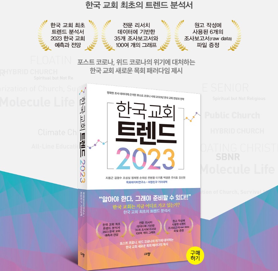 어느덧 2022년도 얼마 남지 않았습니다. 한 해 돌아보며 어떻게 살았나 자문해 보는 시간입니다. 최근 코로나19로 인해 많은 사회적 변화가 한국 사회에 있었습니다. 비대면, 디지털, 온라인화에 따른 사회 변화는 한국 교회에도 많은 변화를 가져왔습니다. 이에 대해 목회 데이터베이스 연구소는 목회자와 교인, 일반 국민을 대상으로 조사하여 ‘한국 교회 트렌드 2023’ 서적을 발간하였습니다. 이 보고서는 교회가 위기의 시대에서 벗어나 어떻게 회복할 것인가에 대한 내용을 담고 있으며, 앞으로 한국 교회가 나아가야 할 방향을 제시하고 있습니다.