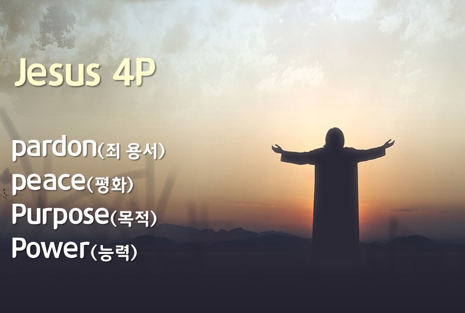 예수 그리스도께서 믿는 자들에게 4P를 주십니다. pardon(죄용서), peace(평화), Purpose(목적), Power(능력)을 보장해 주십니다.