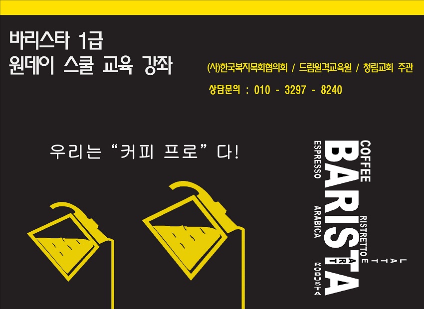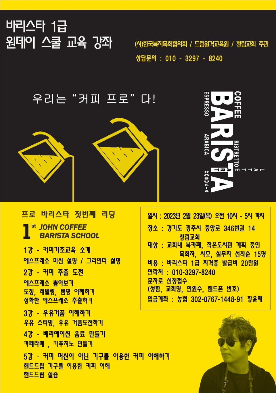 (사)한국복지목회협의회(대표 장윤제 목사)과 시인이 볶는 커피가(대표: 최요한 로스터스) 공동주관하는 바리스타1급 원데이스쿨교육강좌가 2월23(목)오전10시~오후5시까지 청림교회(경기 광주)에서 두 번째로 열린다.