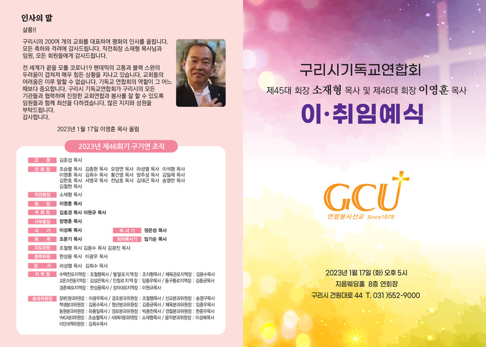 구리시기독교연합회는 지난 17일(화) 지음웨딩홀 8층 연회장에서 구리시기독교연합회 회장 이취임 예식을 가졌다.