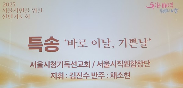 이어서 특송 “바로 이날, 기쁜날”을 서울시청기독교선교회와 서울시직원합창단이 연합으로 하나님께 영광을 돌렸다.