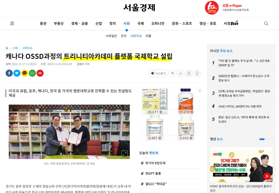 교회 내 작은도서관 운동으로 다음세대 주중돌봄 방과후학교와 지역사회열린학교 운영을 통한 한국교회 대안목회를 제시한 (사)한국복지목회협의회 장윤제 대표가 이번에는 한국교회 다음세대 글로벌 인재 양성하기 위한 대안교육으로 플랫폼 대안교육기관인 ‘트리니티아카데미’를 설립했다. 이와 관련, 트리니티아카데미(이사장 장윤제 목사)는 최근 캐나다 ‘콘코디아교육재단’(대표 데이비드 강)과 온·오프라인 고등학교 교육과정 및 대학교 교육사업을 함께 운영하기 위해 업무협약을 체결했다.