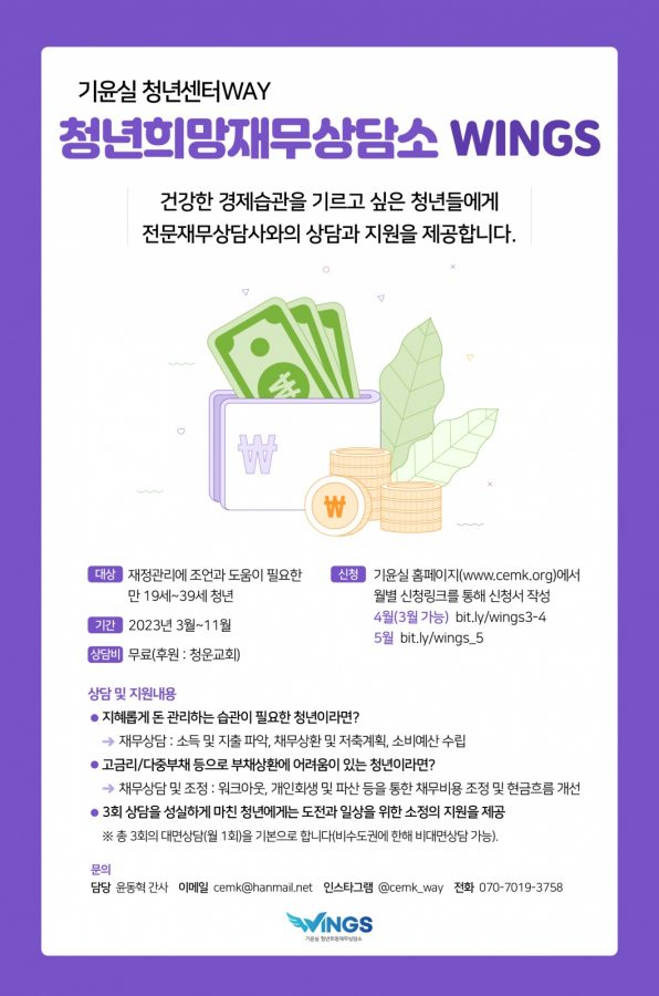 경제적 어려움을 겪고 있는 청년들의 재정관리 및 부채해결을 위한 전문재무상담사와의 재무/채무상담과 지원을 통해 청년들을 돕고자 개설된 <청년희망재무상담소 WINGS 윙즈>는 만 19-39세 청년이라면 누구나 상담 받을 수 있다. 상담 비용은 전액 청운교회(담임 이필산 목사)에서 지원한다. 이 프로그램을 통해 경제적인 어려움을 겪는 상당 수 청년들이 도움을 받고 있다.